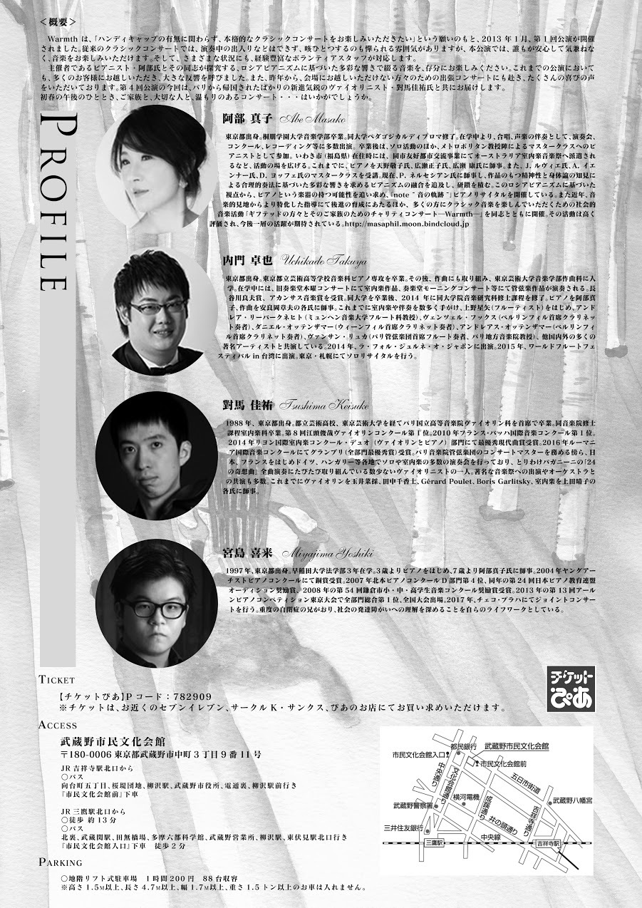当教室の門下生で、ピアニストの内門卓也リサイタル第二弾。今回は名古屋と東京での開催となります。曲目は、フランス組曲 第5番 ト長調 BWV816(J.S.バッハ)、3つの演奏会用練習曲 「悲しみ」 「軽やかさ」 「ため息」(リスト)、スペイン狂詩曲(リスト)、エレジー 作品3-1(ラフマニノフ)、コレッリの主題による変奏曲 作品42(ラフマニノフ)他。皆様のご来場をお待ちしております。